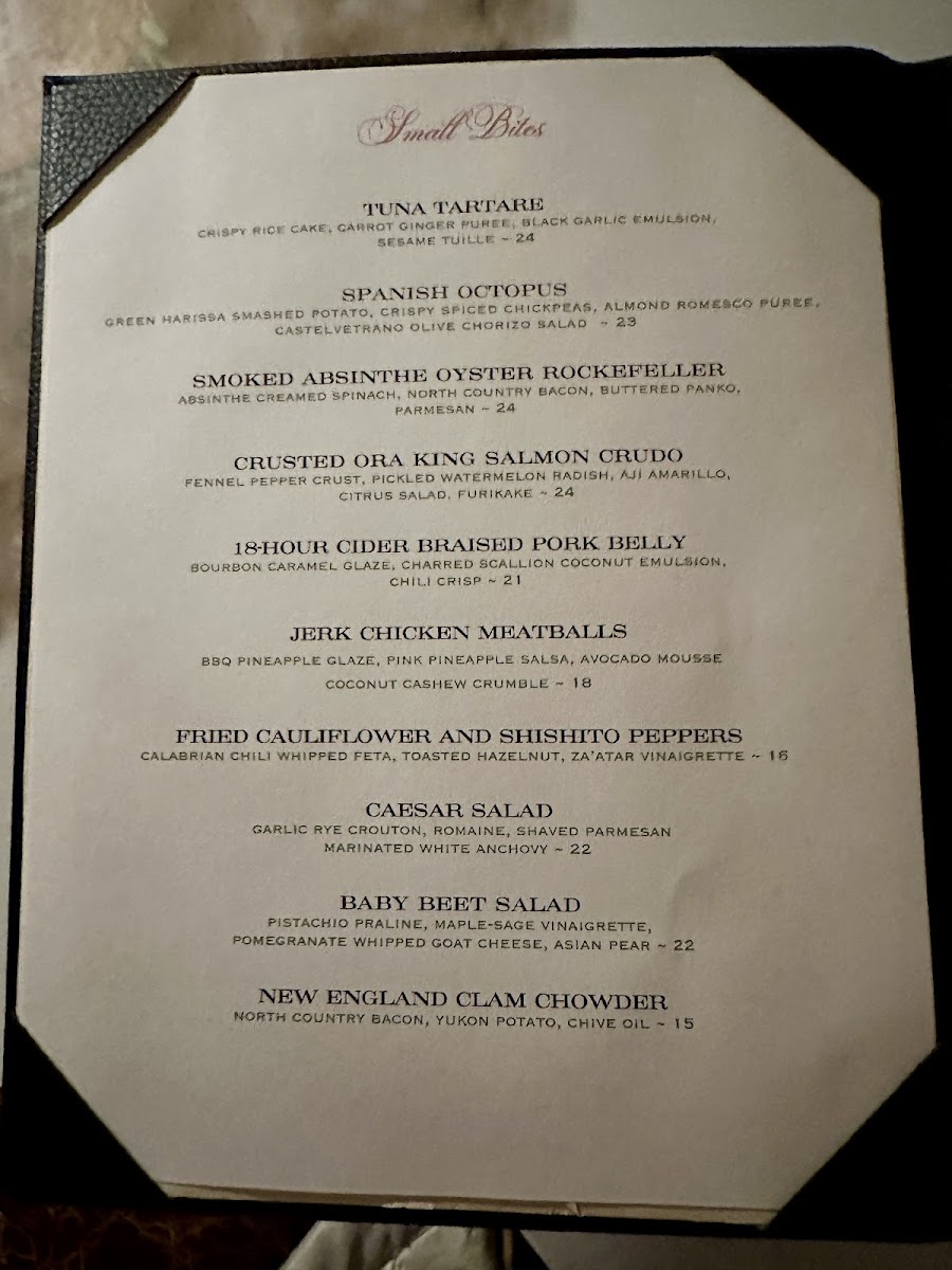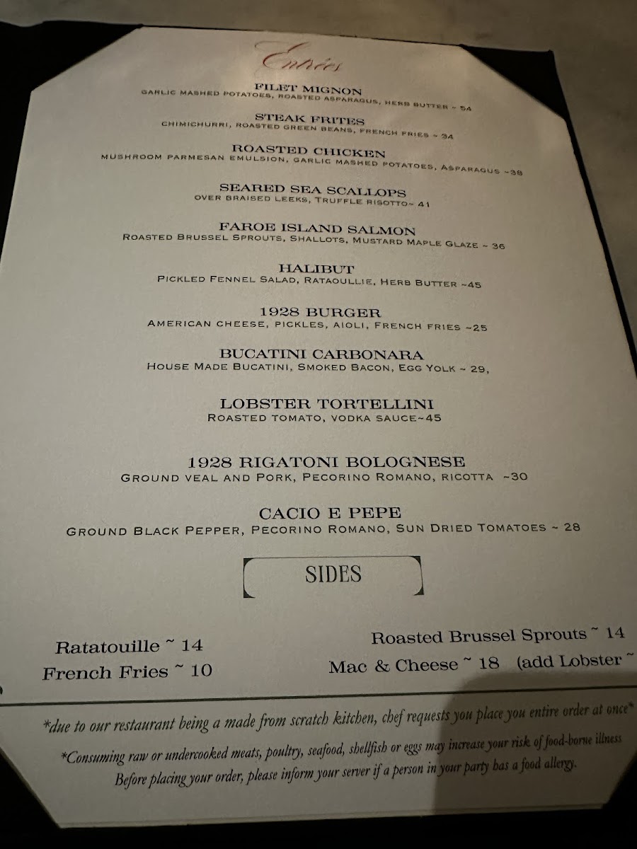 As you delve deeper into the main courses, the Wagyu Entree and Scallops Entree shine, as noted in a guest review that raved about the impeccable freshness and execution, particularly highlighting the scallops as unforgettable. Pair your meal with sides like the decadent 1928 Au Gratin ($12), a sumptuous blend of flavors that elevates the dining experience to delightful heights.